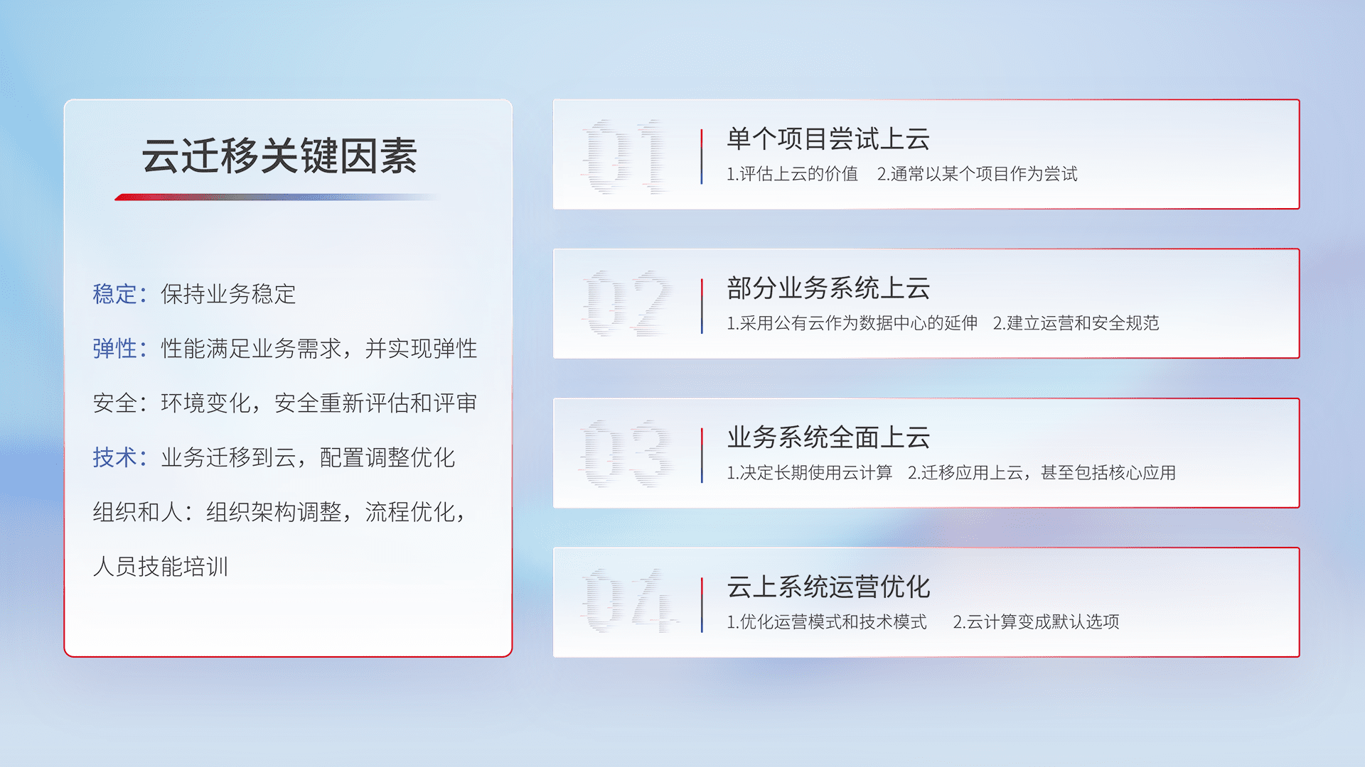 结合实际业务,,,从规划设计、、云平台选型、、云原生改造、、、、数据迁移、、、集成交付,,,,迁移全过程为客户识别最佳上云路径,,做好风险识别管理,,设计网络架构、、、、身份权限、、、、安全审计合规、、操作审计、、、日志审计、、、、监控告警策略、、、、多站点容灾设计等,,,,对云上基础设施进行整体规划,,,,提升IT治理水平,,,,以满足弹性、、、、高可用、、、高性能的需求。。